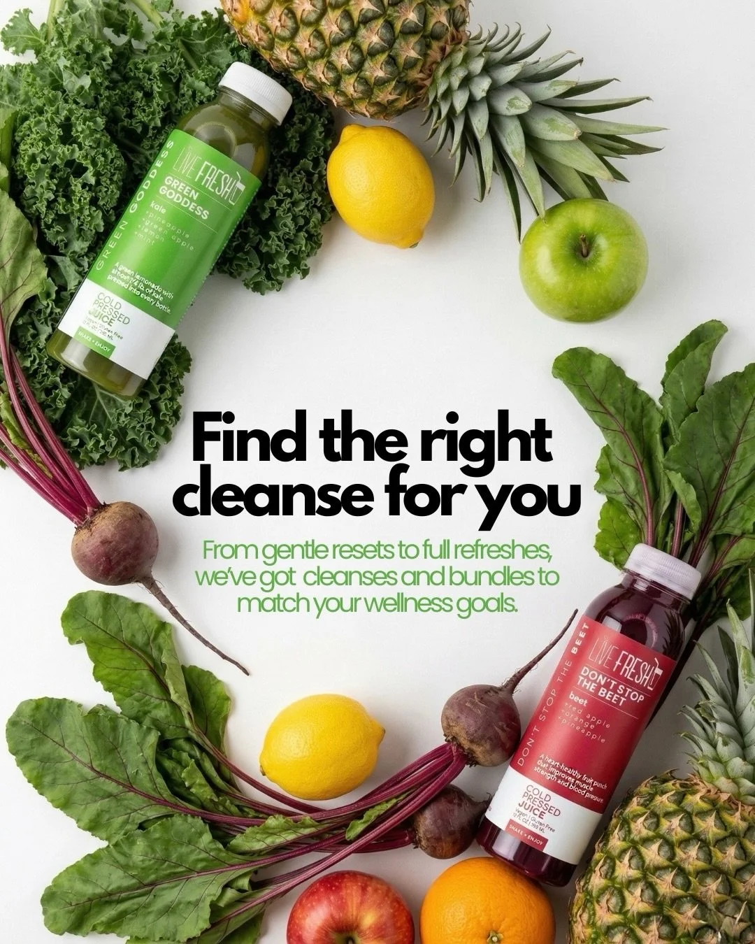 Nourish and hydrate yourself into a healthy and balanced lifestyle by giving your metabolism a reset. Give your digestive system a chance to rest and recharge with a Live Fresh juice cleanse that best suits your needs.